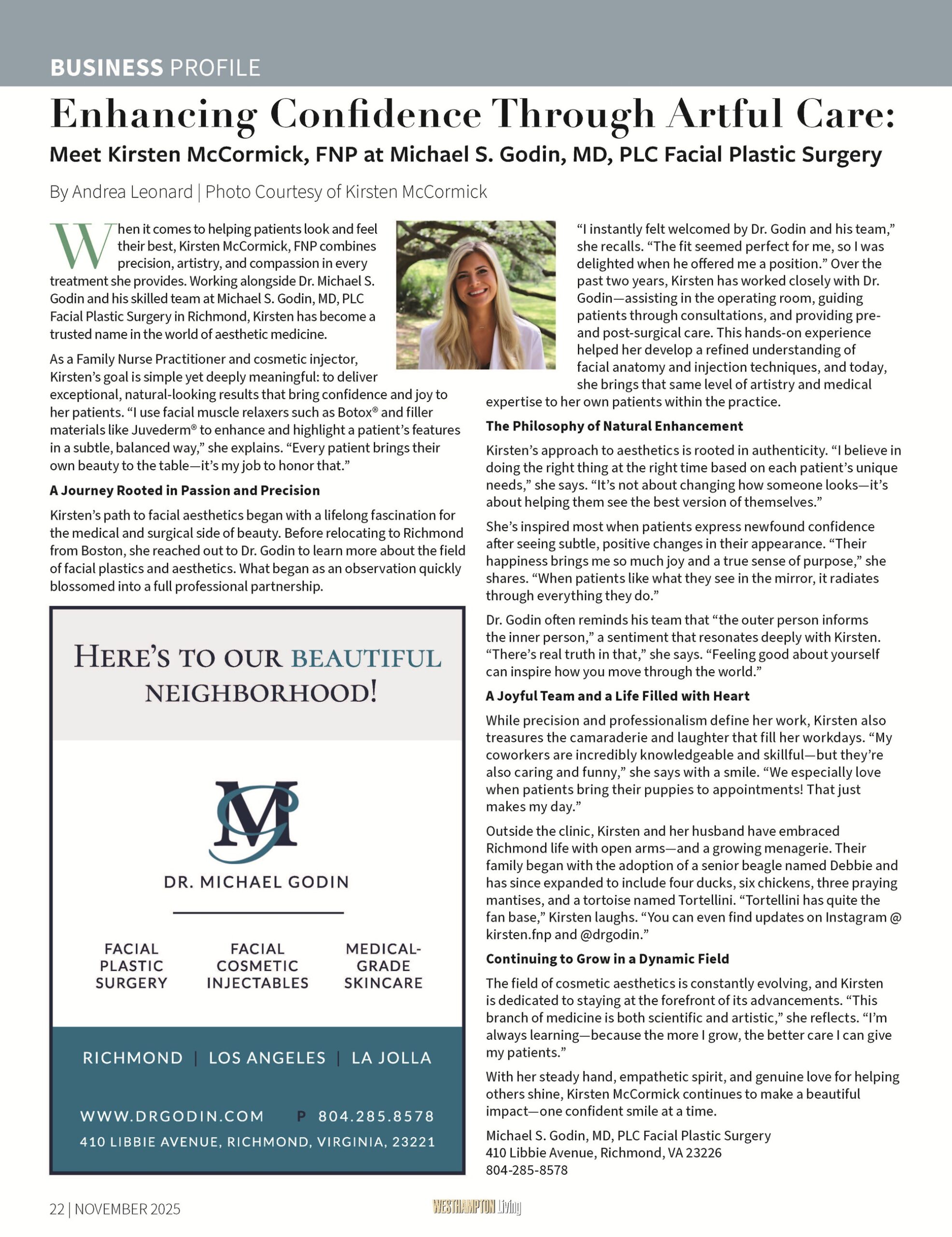 Westhampton Living. “Enhancing Confidence Through Artful Care: Meet Kirsten McCormick, FNP at Michael S. Godin, MD, PLC Facial Plastic Surgery.” November 2025.